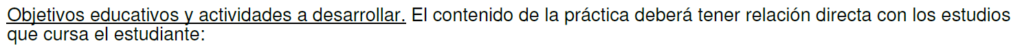 - Objetivos educativos y actividades a desarrollar en el Convenio de prácticas tiene que ser el mismo que el Proyecto formativo de la solicitud (Copiar y pegar). Ver ejemplo en la imagen siguiente