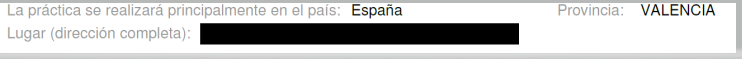 El lugar de la práctica tiene que ser la dirección completa, numero de salida, CP, etc. ejemplo: Camí de Vera, s/n Edificio 8G, Planta 4ª, 46022 Valencia
