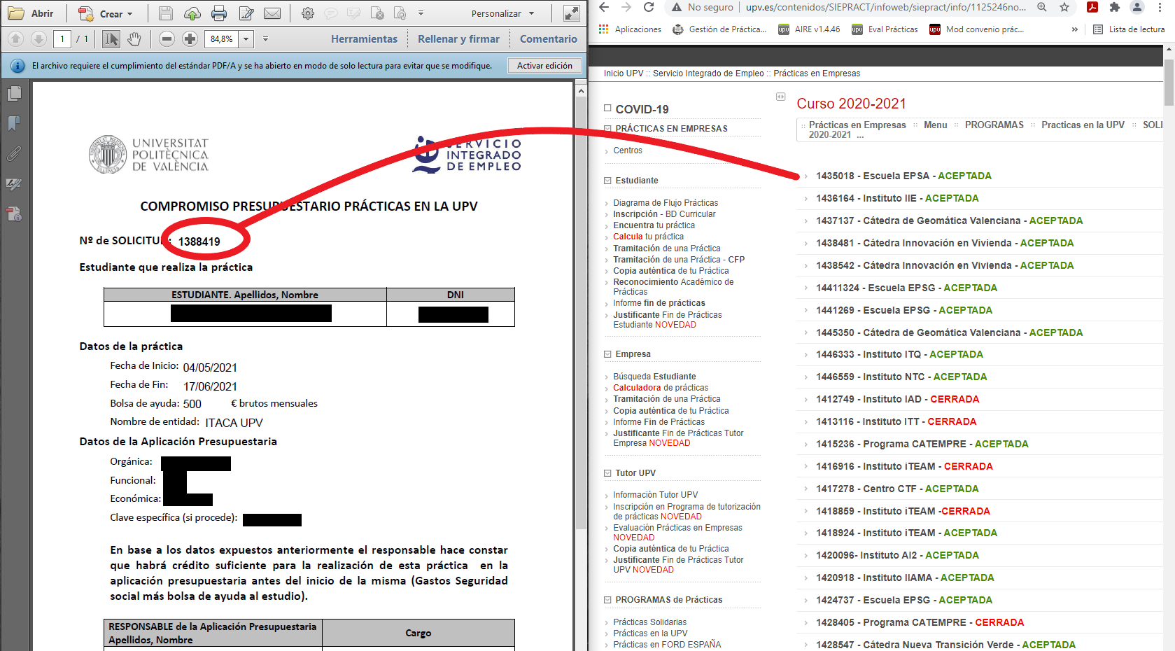 - Se ha de revisar en las solicitudes aceptadas correspondientes al año académico actual la correcta aceptación del compromiso presupuestario antes de enviar el convenio a la oficina de prácticas.