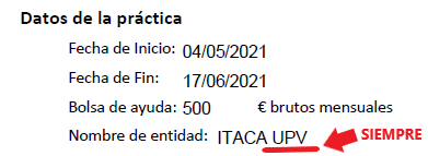 - Las prácticas han de realizarse en la UPV, si hay salidas esporádicas se han de indicar en los campos destinados para ello (dirección, provincia, etc.). Ver ejemplo en la imagen siguiente