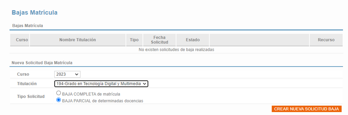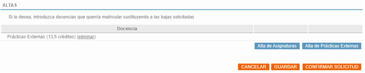 En primer lugar, solicita la baja de asignaturas tal y como se muestra en la captura anterior. En segundo lugar, has de darte de alta de los créditos curriculares: