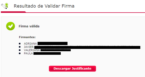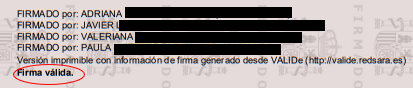 La aplicación generara un documento donde, en el marco izquierdo del mismo, aparecerán las personas cuyas firmas son válidas. Si falta una persona, por favor que verifique el estado de su firma en la misma página en la opción: Validar Certificado.