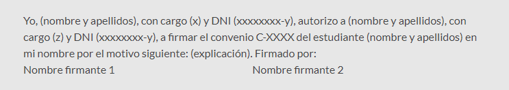 A excepción del representante legal de la empresa y del estudiante, estas firmas electrónicas siempre deben ser correctas para que se pueda tramitar el convenio, no se aceptarán documentos de firma por orden para estos casos.